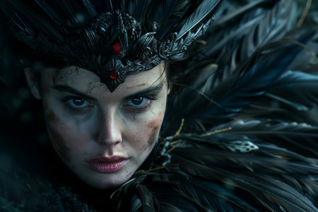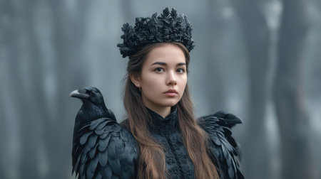 A captivating portrait of a young woman adorned in a feathered crown and dark attire, set in a foggy forest with a raven on her shoulder, evoking mystery and elegance.