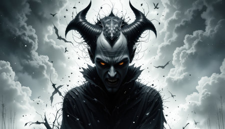 Detailed digital illustration of an intimidating demonic figure, set against a backdrop of stormy clouds. The figure's expression and dark attire enhance its menacing presence.