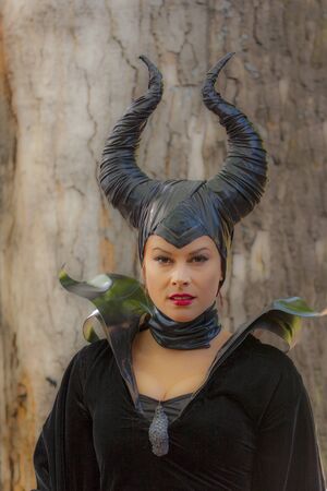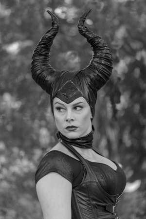 Calgary Canada - Sept 01, 2014: Illustrative cosplayer dressed up as witch with horns. Demonic, dark with red lips. Evil and beautiful.