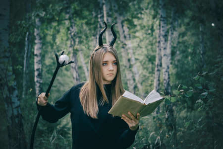 Beautiful young girl with brown hair in a witch costume, with a staff, horns, a book, against the background of a dark forest. Halloween, selective focus.Tinting for an old photo with a grainy overlay