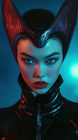 Capturing a fashion-forward moment, a model showcases bold makeup and a unique hairstyle. Her atmosphere exudes a futuristic vibe, highlighted by dramatic lighting in a vibrant color palette.