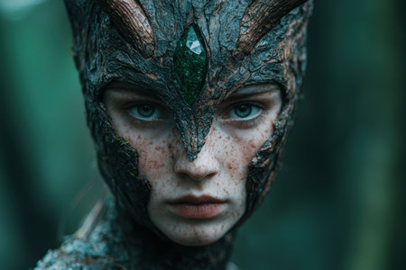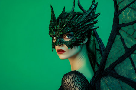Model wearing scale like mask and wings posing on vibrant green background, creating a mysterious and fantastical atmosphere