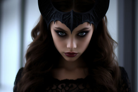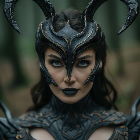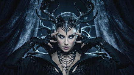 Dark queen with black horns and red lips in dramatic Halloween portrait Witch with smoke — fantasy and villain inspired look
