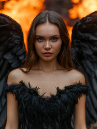 Fantasy lady in a black dress with huge wings. Demon with horns. Dark gothic fashion glamorous character woman. beauty queen. fabulous landscape of autumnal nature. Sunset with fog over the mountains