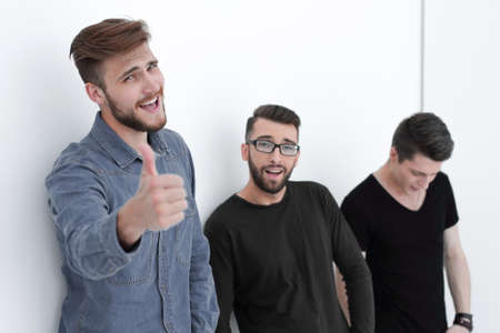 casual men next to the wall showing thumbs up