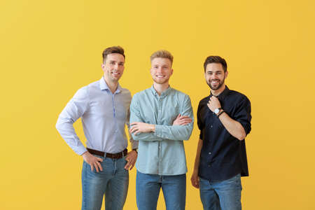 Fashionable young men on color background