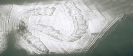 Modern tooth transparent aligners or braces to straighten teeth in cosmetic dentistry and orthodontics with trendy shadows, selective focus