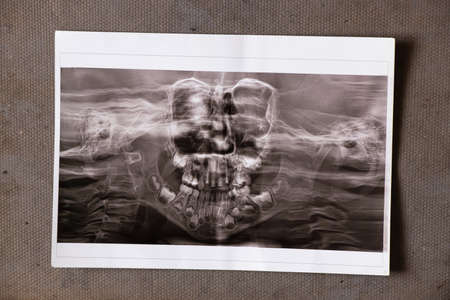 Survey radiography of the skull of a man. A doctor radiologist is studying an x-ray examination. A snapshot of the skull is placed on the patient’s head.
