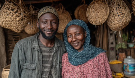 Smiling African American couple in a market, surrounded by handmade woven baskets, highlighting their craftsmanship and connection to local culture and community