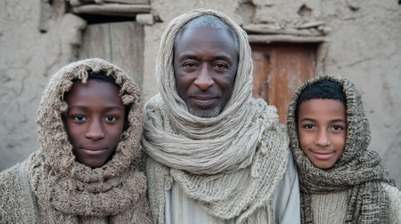 A father and two chadian arabic sons posing in traditional clothing outdoors near their home