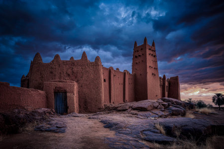 The majestic great mosque of agadez standing tall against a dramatic sunset sky in niger
