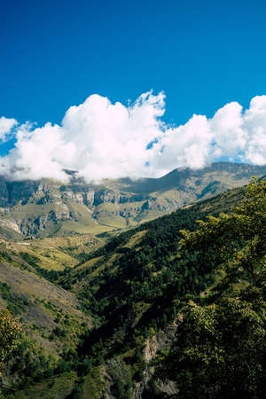 Picturesque mountain landscape of the North Caucasus, Russia. Green hills against blue sky. Concept of adventure, travel, wanderlust