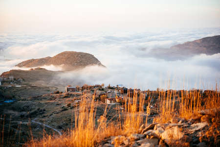Beautiful sea of clouds in the morning in the mountains. Rocky mountains with cliffs covered with thick clouds after sunset