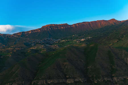 mountain landscape with a village on a slope under a huge rocky ridge, Gunib in Dagestan