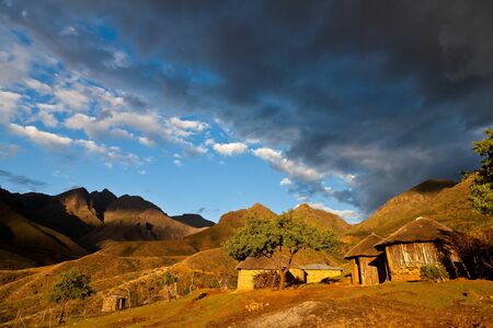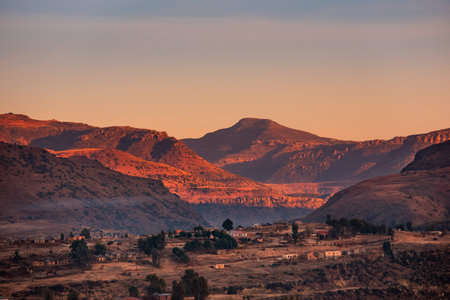 Dilli Dilli, a remote village on a hill in Lesotho, with red mountains in the background