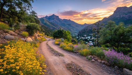 Nestled in the mountains, a village with terraced fields comes alive under the golden hour. The peaceful atmosphere highlights the natural beauty and rural charm of this high-altitude location.