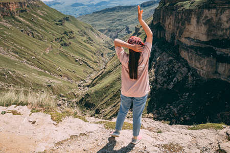 Young woman sitting on hill. Side view of young dreamy female sitting on altitude and looking at Peaks of magnificent rocks located against bright cloudy sky.