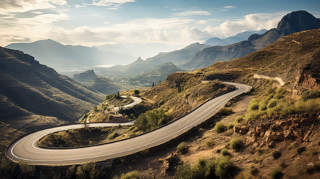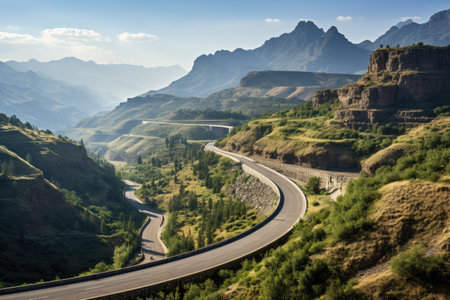 Mountain road. Landscape with rocks, sunny sky with clouds and beautiful asphalt road in the evening in summer. Highway in mountains, Generative AI illustration