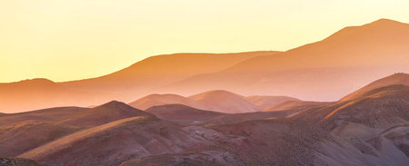 Majestic mountains bathed in warm golden light create serene landscape. rolling hills and valleys evoke sense of tranquility and natural beauty, perfect for outdoor enthusiasts