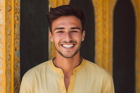 A joyful Tajik man 45 years old dressed in traditional clothing beams with a bright smile against a stunning backdrop, exuding warmth and happiness. A resident of Tajikistan. Generated by AI.