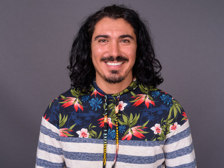 Handsome man with curly hair and mustache against gray backgroun