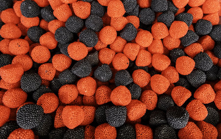 Colorful texture using as background. A lot of sweets. Background 3d rendering illustration. Orange and black multiple jelly candies in powdered sugar. Confectionery wallpaper concept. Copy space. Shallow focus. High quality photo