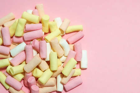 Marshmallows on pink background with copyspace. Flat lay or top view. Background or texture of colorful mini marshmallows.