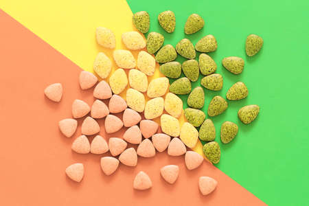 vitamins in pills on a colored background of pastel shades, dietary supplements on a geometric pattern top view, healthy lifestyle concept