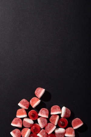 Background - assortment of delicious marmalade jelly candies for sale on counter of shop, grocery, market, cafe. Dessert, copy space, sweet food, pattern and confectionery concept