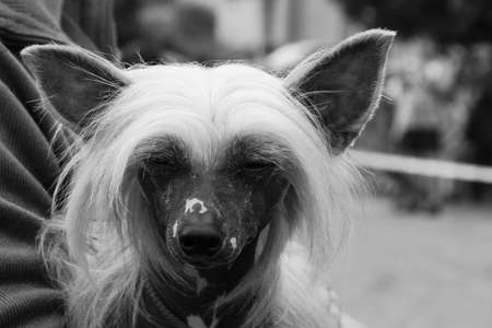 A cute caucasian girl is holding a Chinese crested dog in her arms. Happy girl and her mom are walking in the park with a pet on a sunny autumn day. Close-up. Vertical shot. Soft focus
