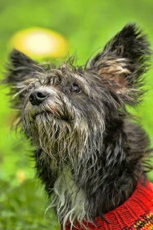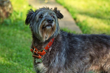 Portrait of a shaggy dog mongrel on a walk in the park on a sunny day