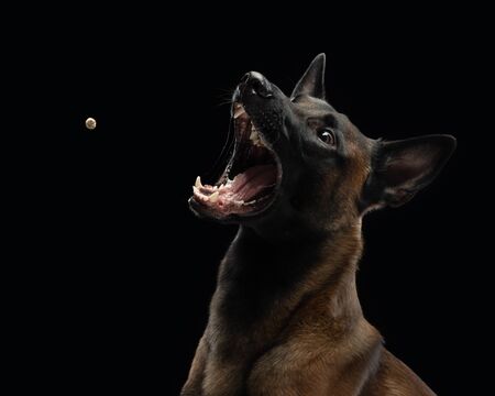 Belgian Shepherd with open mouth. funny dog muzzle. catches food on a dark background in the studio