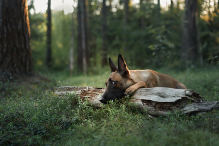 Close-up view of Belgian Shepherd Malinois. Cute dog lying on sunny summer day.