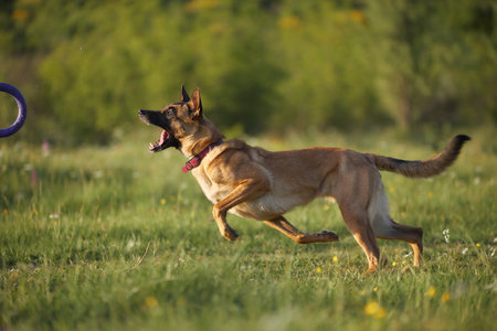 Active malinois dog enjoying a playful run outdoors, moving forward with mouth open