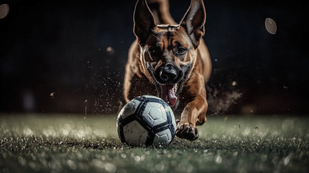 A playful dog is chasing a soccer ball on a grassy field. The image captures the joy and energy of the dog as it engages in a fun outdoor activity. ai generated.