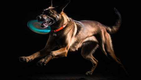 Playful German Shepherd puppy running with toy, full of energy generated by artificial intelligence