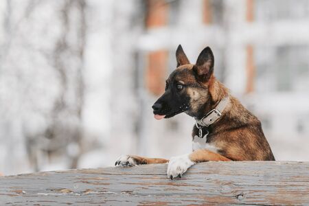 Russia, Krasnodar 31.01.2021 training of working dogs at the stadium. Dog stares loyally at its owner with its mouth open. Belgian Shepherd Malinois rests after training.