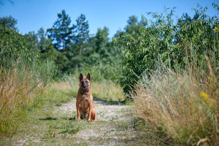 Portrait of a Belgian Shepherd Malinois sitting on a country road