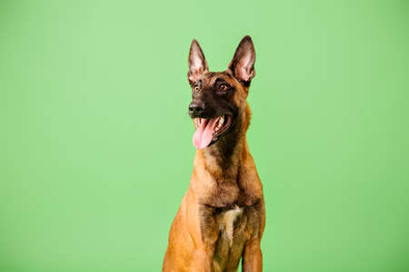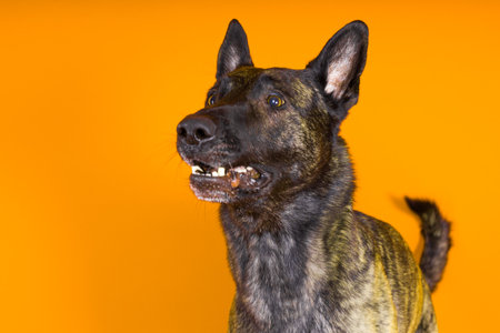 Studio portrait of a malinois dog on a yellow background. Copy space.