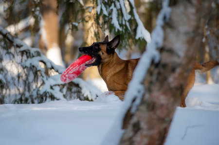 Belgian shepherd malinois dog with a training pillow. Selective focus.
