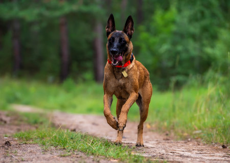 Malinois Belgian Shepherd dog running in the forest on a summer day