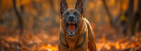 Active healthy happy dog of belgian shepherd malinois dog breed in autumn fall park full of leaves. Colorful autumn season.