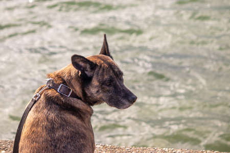 A Belgian Malinois dog leans on a balustrade overlooking the sea