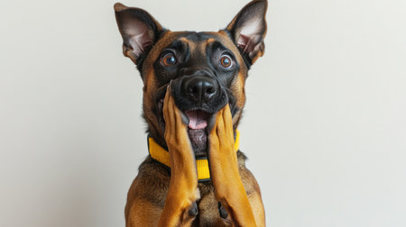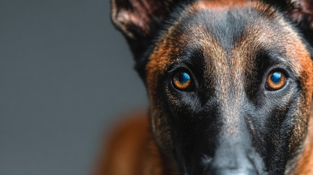 Stunning Close Up Portrait of a Belgian Malinois with Expressive Amber Eyes on Soft Gray Background