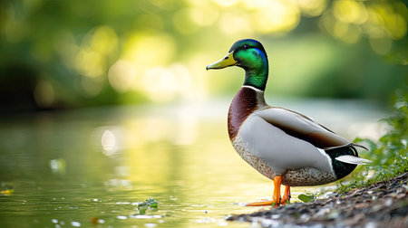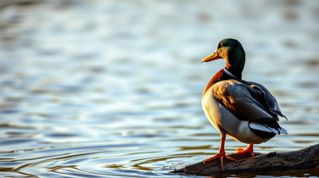 Mallard duck standing by the water at sunset, showcasing vibrant plumage and serene reflections on the surface