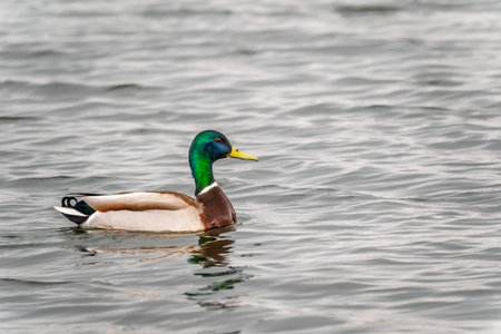 Drake Mallard (Anas platyrhynchos) duck swimming on open water during winter. Selective focus, background blur and foreground blur.