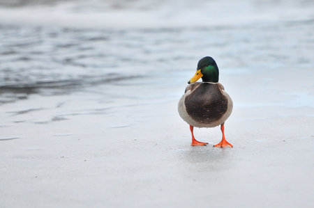 Drake, mallard, wild duck, Anas platyrhynchos, on the snow and on the shore of the pond.