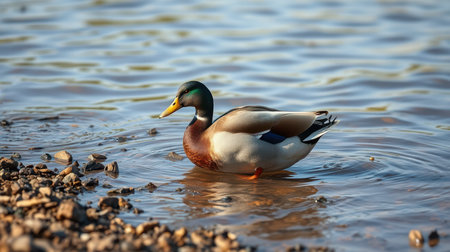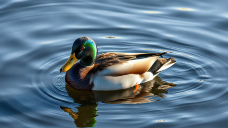 A mallard duck swims peacefully in a serene lake surrounded by gentle ripples under soft natural light