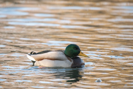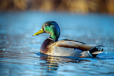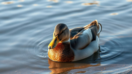 Majestic mallard duck swimming calmly in a serene lake during golden hour