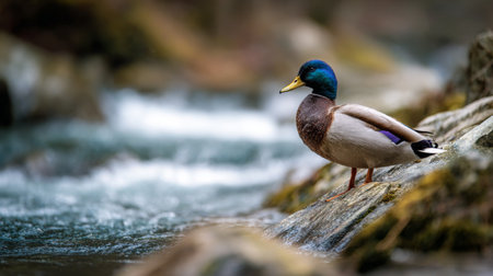 A beautiful male mallard duck resides peacefully on a rocky bank by a flowing stream, showcasing vibrant colors and natural beauty in a tranquil environment.